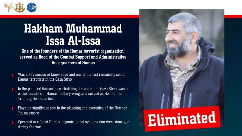 IDF dhe Shin Bet (Agjencia e Sigurisë së Izraelit) kanë thënë se kanë vrarë Hakham Muhammad Issa al-Issa, një anëtar të lartë të krahut ushtarak të Hamasit, në sulmet e gjera të së premtes në lagjen Sabra të Qytetit të Gazës.