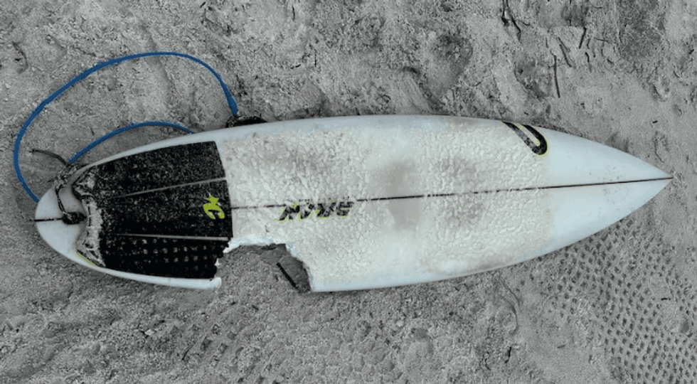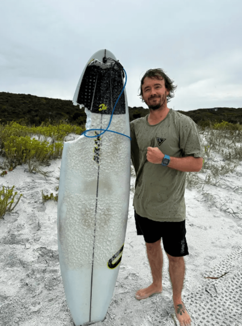 Një sërfist australian është me fat që është gjallë pas një përplasjeje me një peshkaqen - por dërrasa e tij e sërfit nuk ishte aq me fat.
