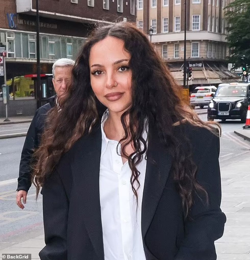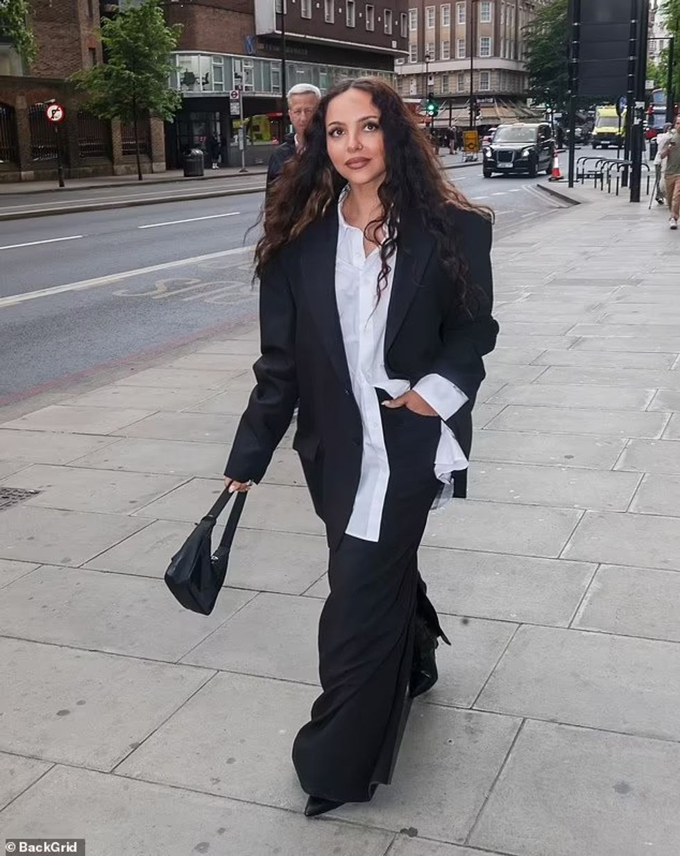 Ish-anëtarja e grupit Little Mix, 32 vjeç, u shfaq elegante me një këmishë të bardhë poshtë xhaketës dhe një fund të gjatë të zi, ndërsa tërhoqi vëmendjen me çantën e saj luksoze të markës Prada.