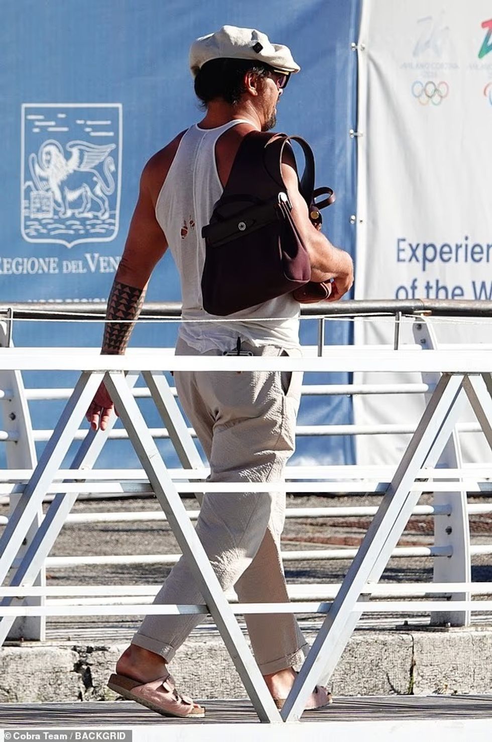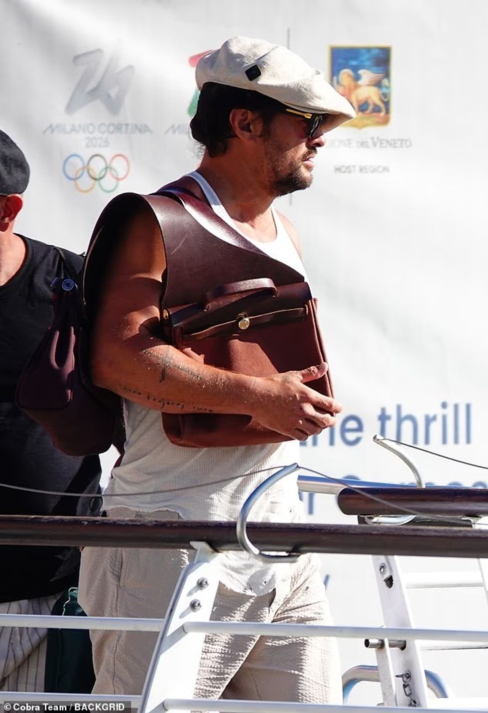 Momoa u fotografua në aeroportin e Venecias, përpara se të hipte në një taksi me varkë që e priste pranë. Në shpatullën e tij të djathtë ra në sy edhe një çantë “man bag”, që i plotësonte pamjen e rastësishme, shkruan DailyMail.