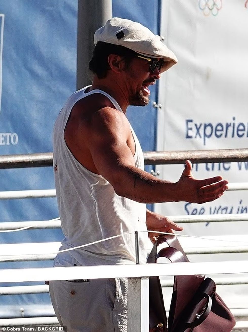 46-vjeçari u pa me humor të mirë teksa zbarkoi në qytetin italian, duke mbajtur një stil të thjeshtë e veror: pantallona të lehta prej pambuku në ngjyrë krem, një kanotierë të bardhë dhe një kapele klasike “newsboy” për t’u mbrojtur nga dielli.
