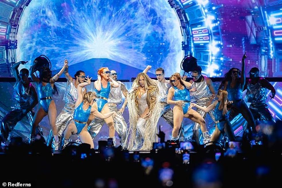 Për natën e shtatë të turneut, J-Lo dha maksimumin – duke shkëlqyer që nga momenti i parë me një kostum vezullues që theksonte hiret dhe siluetën e saj për t’u admiruar.