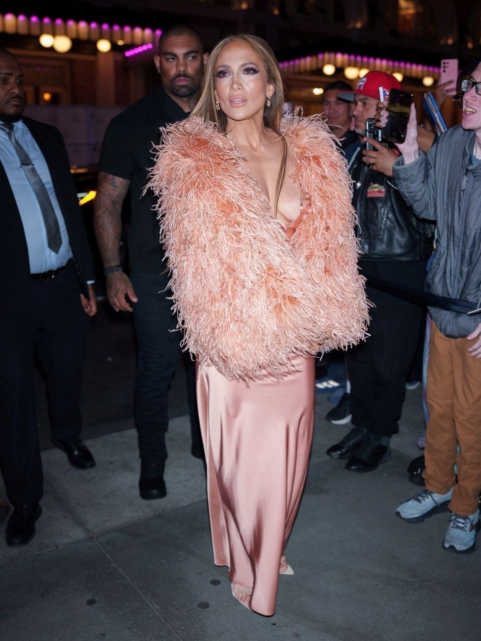 Teksa po pozonte përpara fotografëve, J.Lo e zhvendosi pak pallton për të zbuluar më mirë fustanin, por ky i fundit i rrëshqiti lehtë në pjesën e sipërme, duke zbuluar aksidentalisht më shumë seç duhej.