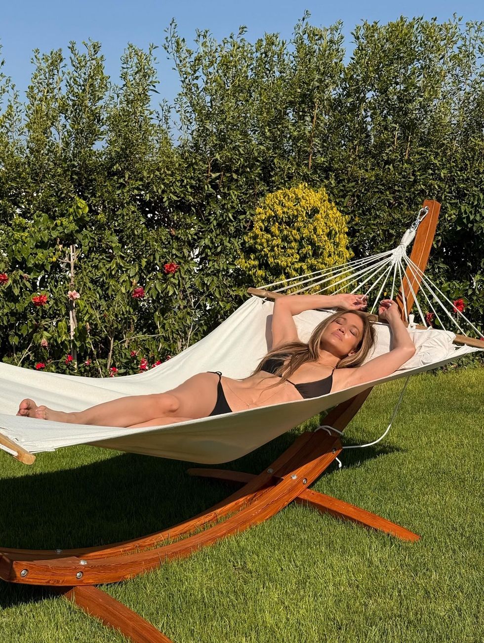 Në një postim në Instagram të titulluar “U ndjeva bukur në Egjipt”, J Lo shfaqet me një trup të tonifikuar, e veshur me bikini të zeza ndërsa pushon në një hamak dhe pozon brenda një kabine me një mbulesë të tejdukshme, kapele të madhe dielli dhe syze.
