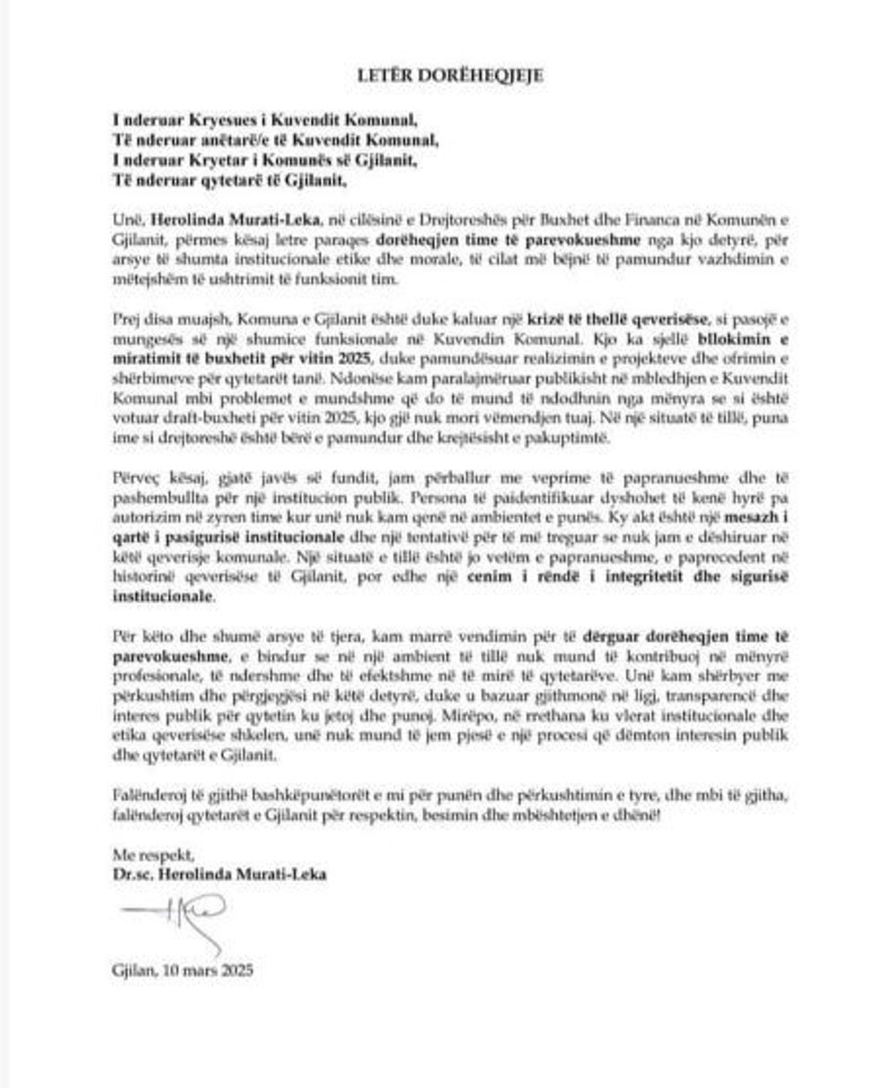 Drejtoresha e Drejtorisë për Buxhet dhe Financa në Gjilan, Herolinda Murati-Leka ka njoftuar se ka dhënë dorëheqje nga pozita.