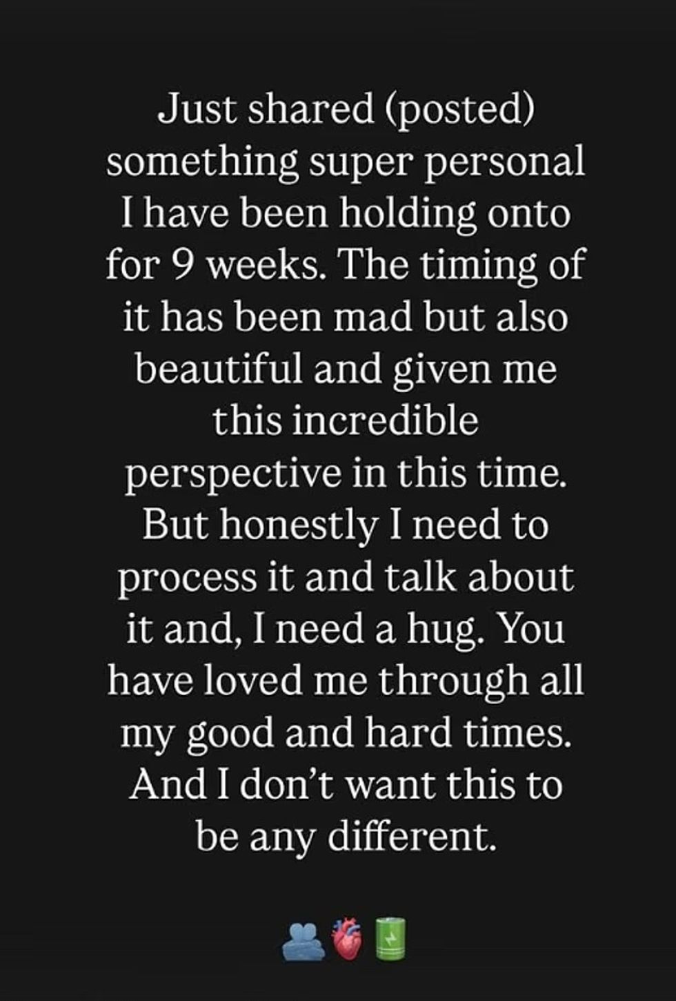 Në një Story në Instagram, ajo shkruajti: “Sapo ndava diçka shumë personale që e kam mbajtur për vete për nëntë javë. Koha ka qenë e çuditshme, por e bukur. Tani më duhet ta përpunoj dhe… më duhet një përqafim”.