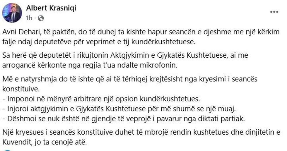 Në një postim në rrjetet sociale, Krasniqi ka theksuar se Dehari është dashur të nisë seancën me kërkim falje për shkeljet e rënda të Kushtetutës dhe injorimin e aktgjykimit të Gjykatës Kushtetuese.