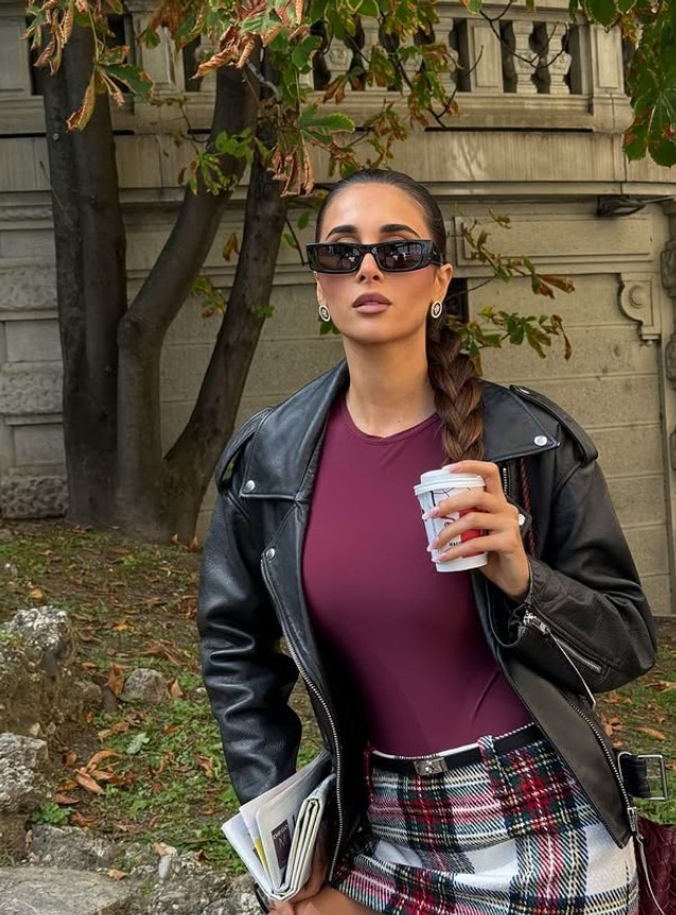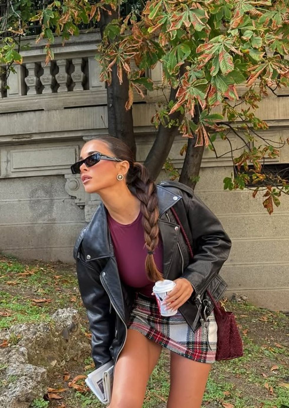 Si aksesorë përfshiu syzet dhe çantën e kuqe, që i dhanë një prekje sofistikuese pamjes së saj, ndërsa flokët e kapura në një gërshetë të gjatë dhe të rregullt përfunduan dukjen me delikatesë dhe stil.