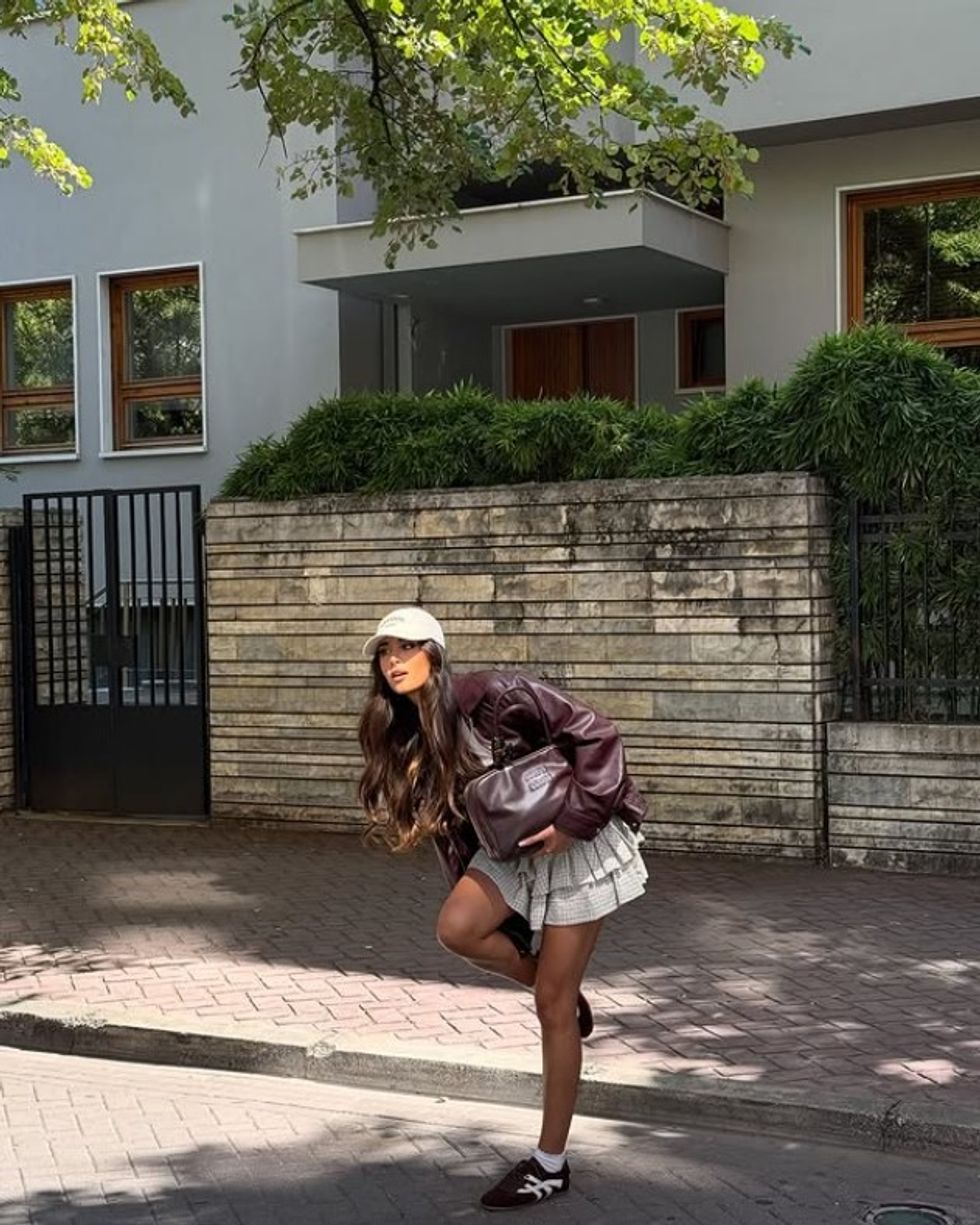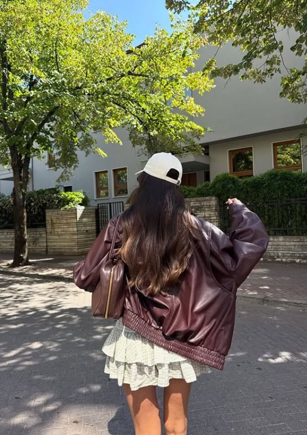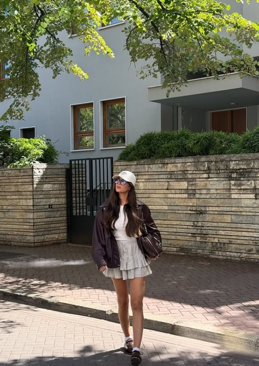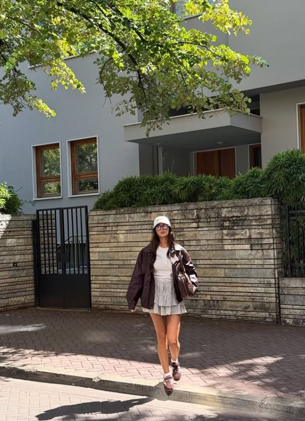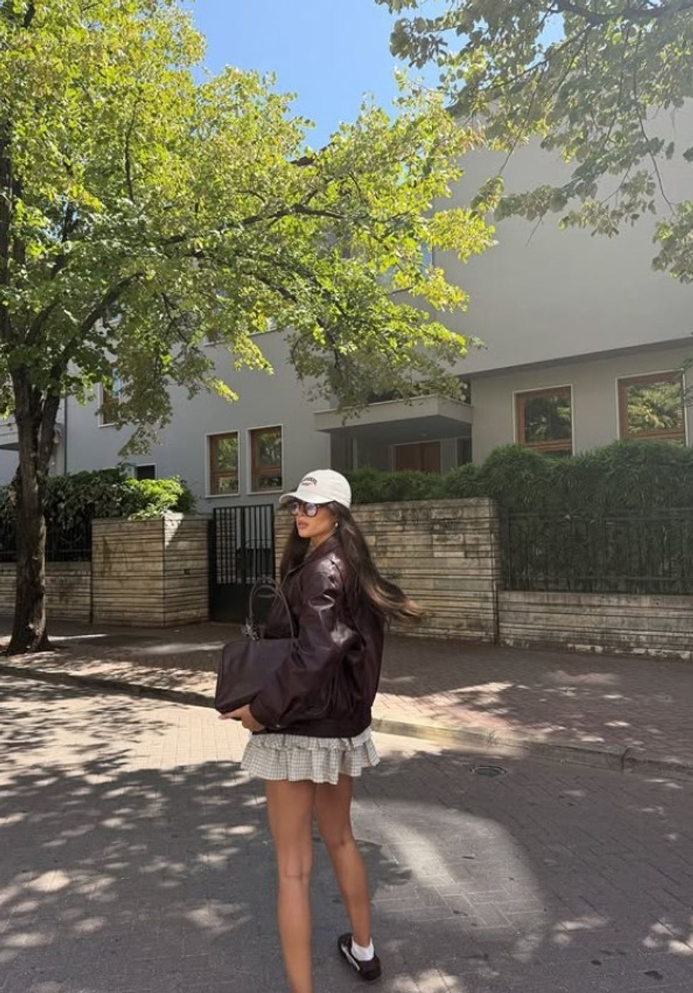 Ajo ka zgjedhur një fustan të shkurtë me pala në ngjyrë të çelur, të kombinuar me një bluzë të bardhë bazike dhe një xhaketë lëkure në ngjyrë kafe të errët.