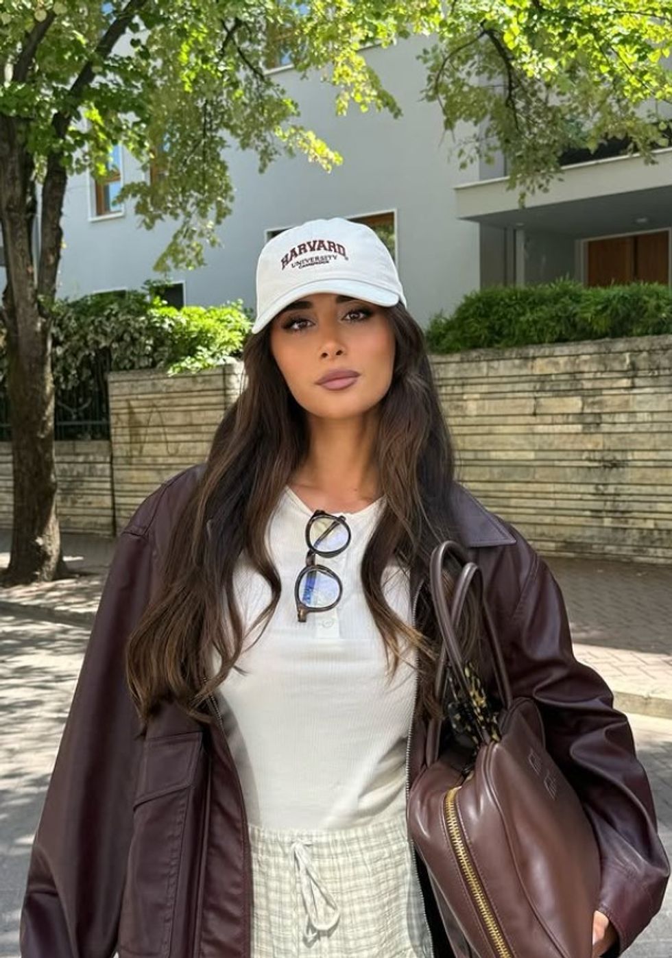 Veshja është plotësuar me një kapele sportive me mbishkrimin “Harvard University”, atlete të stilit retro dhe një çantë të madhe lëkure, që i jep një prekje urbane dhe funksionale dukjes.