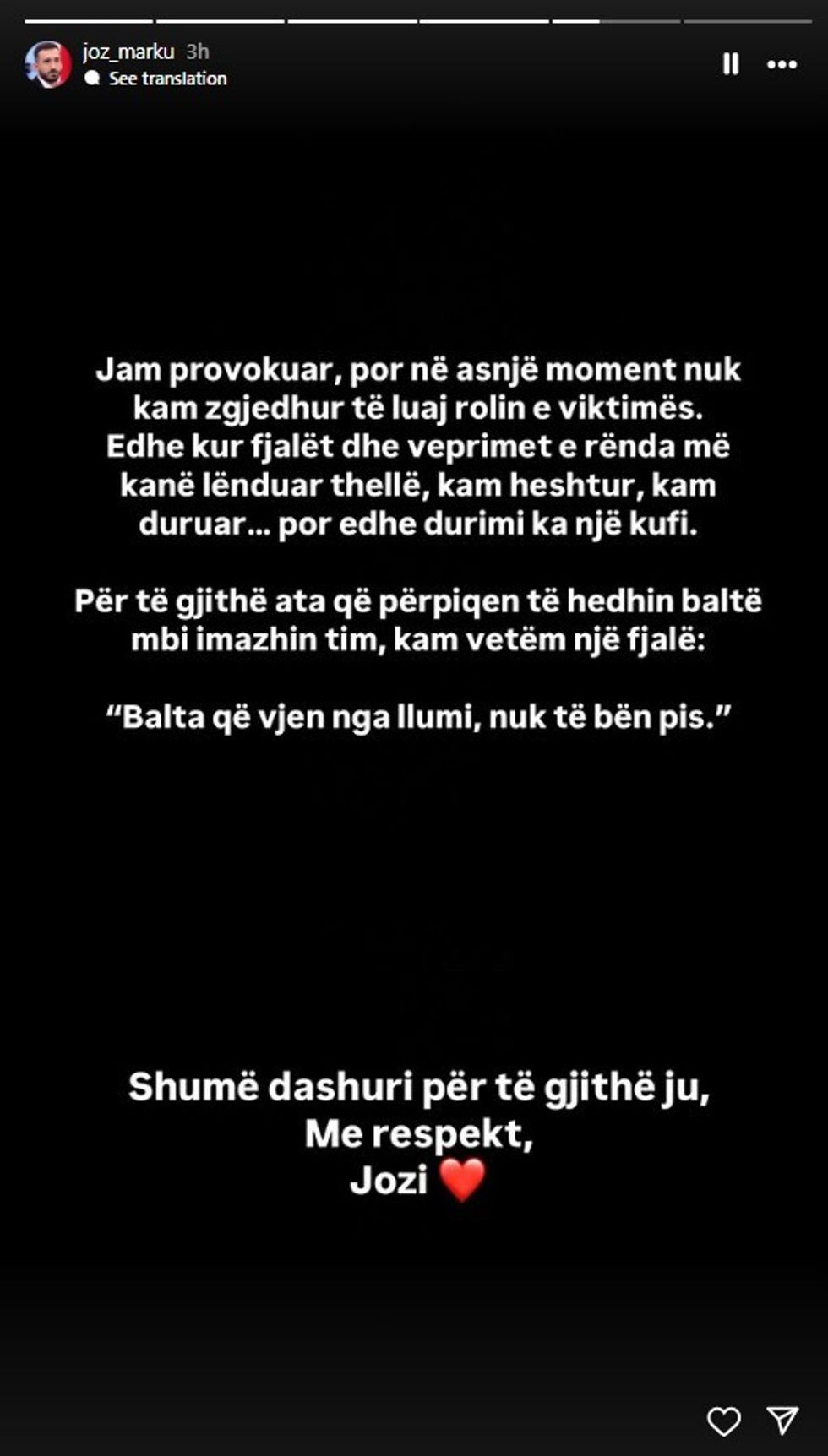 Më tutje ai në një InstaStory tjetër shkruan: Jam provokuar, por në asnjë moment nuk kam zgjedhur të luaj rolin e viktimës. Edhe kur fjalët dhe veprimet e rënda më kanë lënduar thellë, kam heshtur, kam duruar… por edhe durimi ka një kufi. Për të gjithë ata që përpiqen të hedhin baltë mbi imazhin tim, kam vetëm një fjalë: ‘Balta që vjen nga llumi, nuk të bën pis.’ Shumë dashuri për të gjithë ju, Me respekt, Jozi