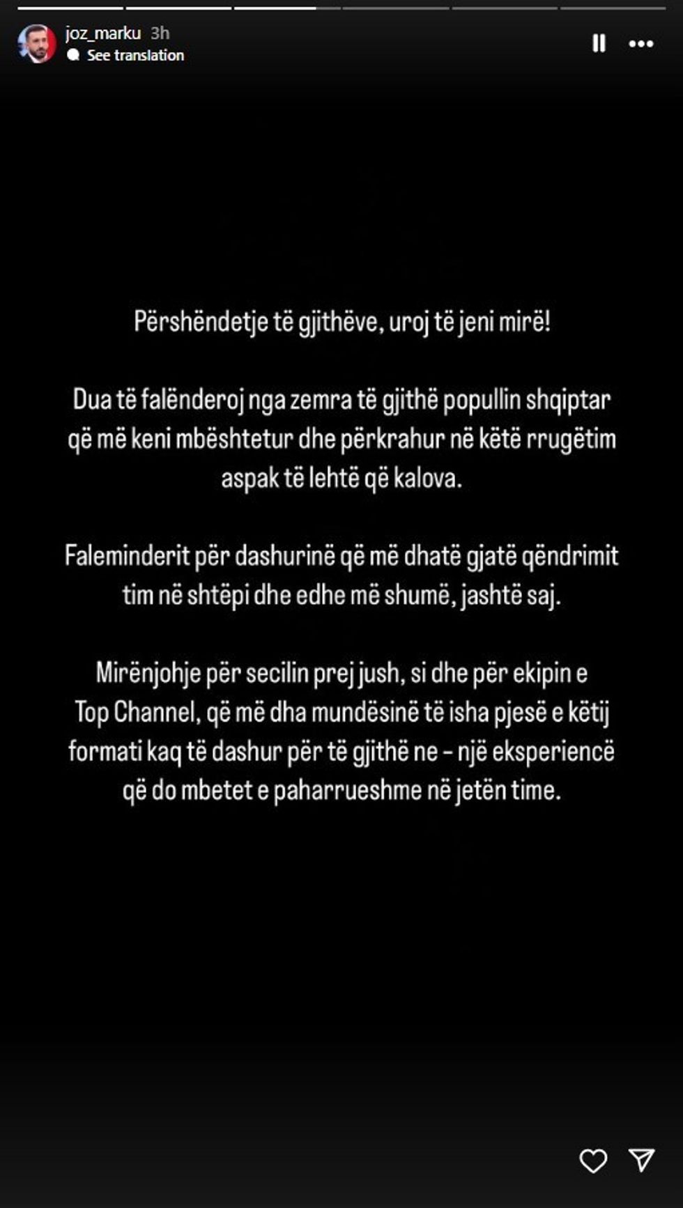 Në një postim të ndarë në Instagram, Jozi shkruan:Përshëndetje të gjithëve, uroj të jeni mirë! Dua të falënderoj nga zemra të gjithë popullin shqiptar që më keni mbështetur dhe përkrahur në këtë rrugëtim aspak të lehtë që kalova. Faleminderit për dashurinë që më dhatë gjatë qëndrimit tim në shtëpi dhe edhe më shumë, jashtë saj. Mirënjohje për secilin prej jush, si dhe për ekipin e Top Channel, që më dha mundësinë të isha pjesë e këtij formati kaq të dashur për të gjithë ne – një eksperiencë që do mbetet e paharrueshme në jetën time.
