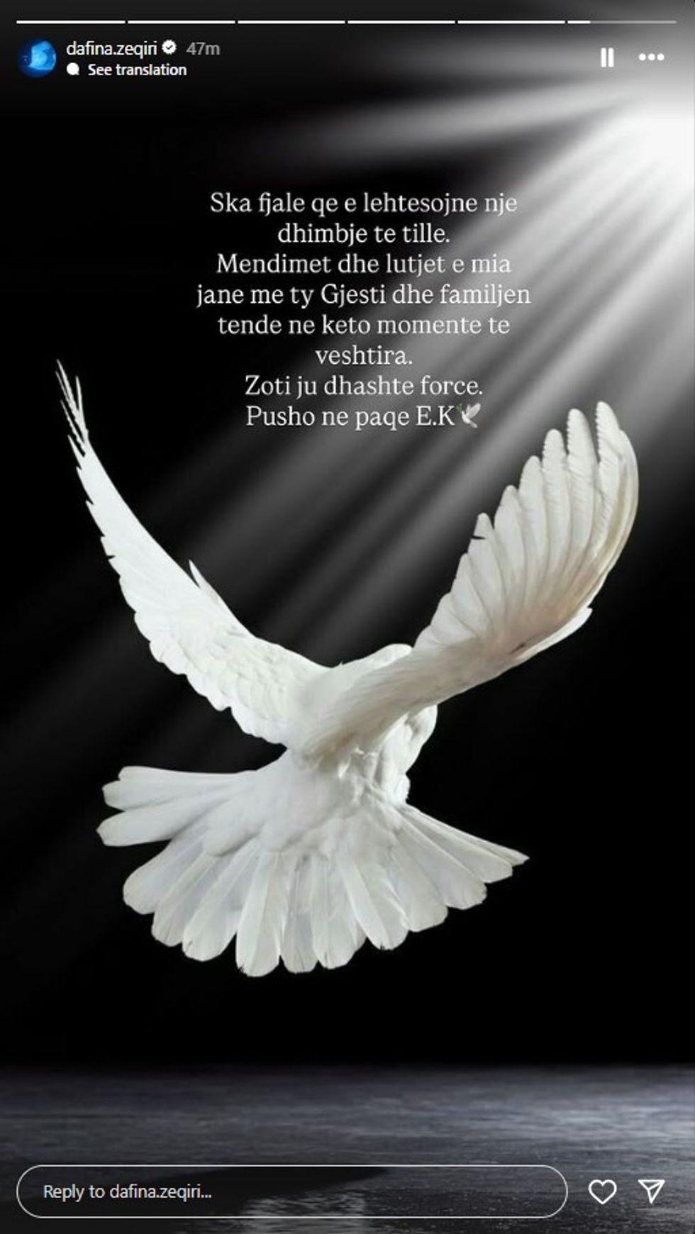 “S’ka fjalë që e lehtësojnë një dhimbje të tillë. Mendimet dhe lutjet e mia janë me ty Gjesti dhe familjen tënde në këto momente të vështira. Zoti ju dhashtë forcë. Pusho në paqe E.K.”