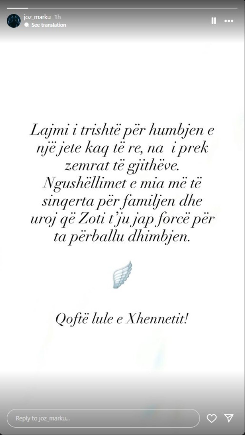 Një reagim ka ardhur edhe nga Joz Marku, ish-banori i Big Brother VIP Albania dhe dikur në konflikt me Gjestin gjatë spektaklit, por që sot ka lënë mënjanë çdo gjë për të dhënë ngushëllimet e tij: