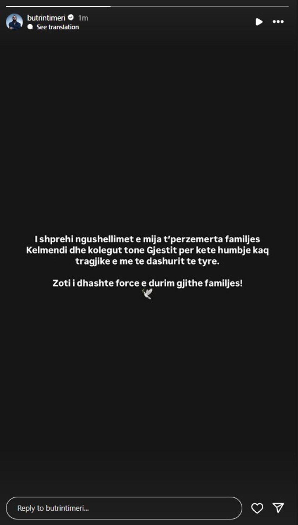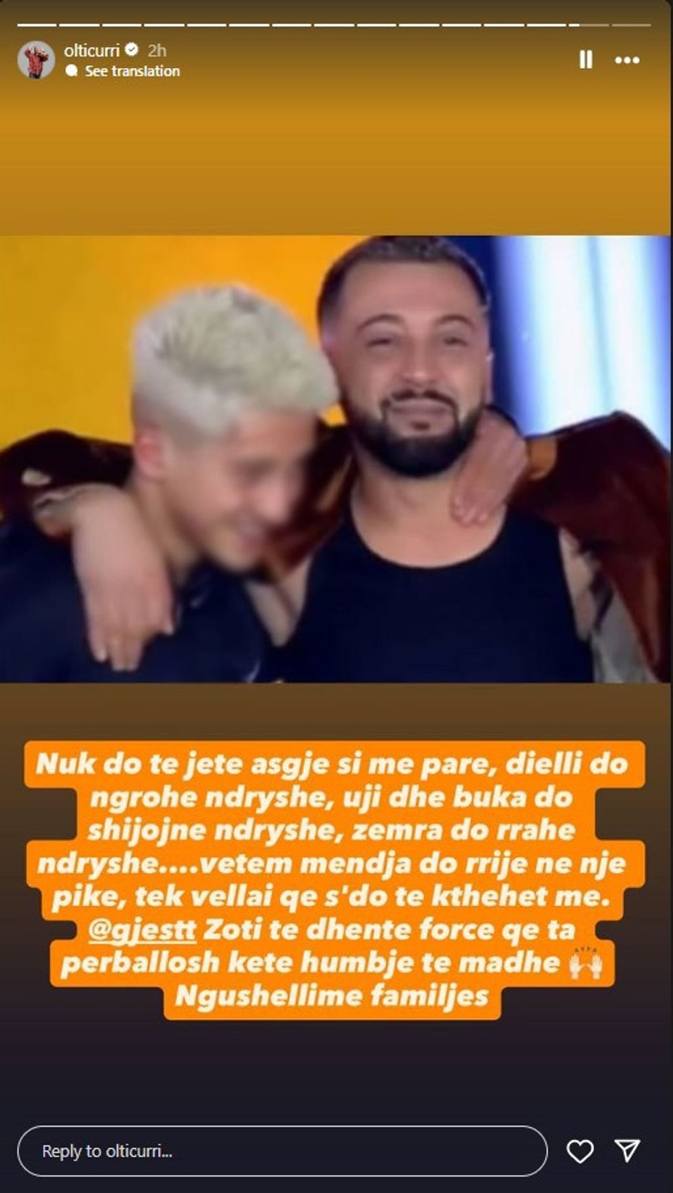 “Nuk do të jetë asgjë si më parë, dielli do ngrohe ndryshe, uji dhe buka do shijojnë ndryshe, zemra do rrahë ndryshe… vetëm mendja do rrije në një pikë, tek vëllai që s’do të kthehet më. @gjestt Zoti të dhashtë forcë që ta përballosh këtë humbje të madhe. Ngushëllime familjes”.
