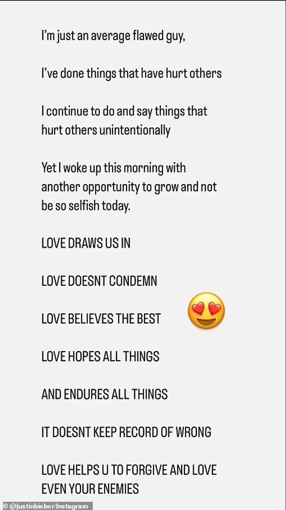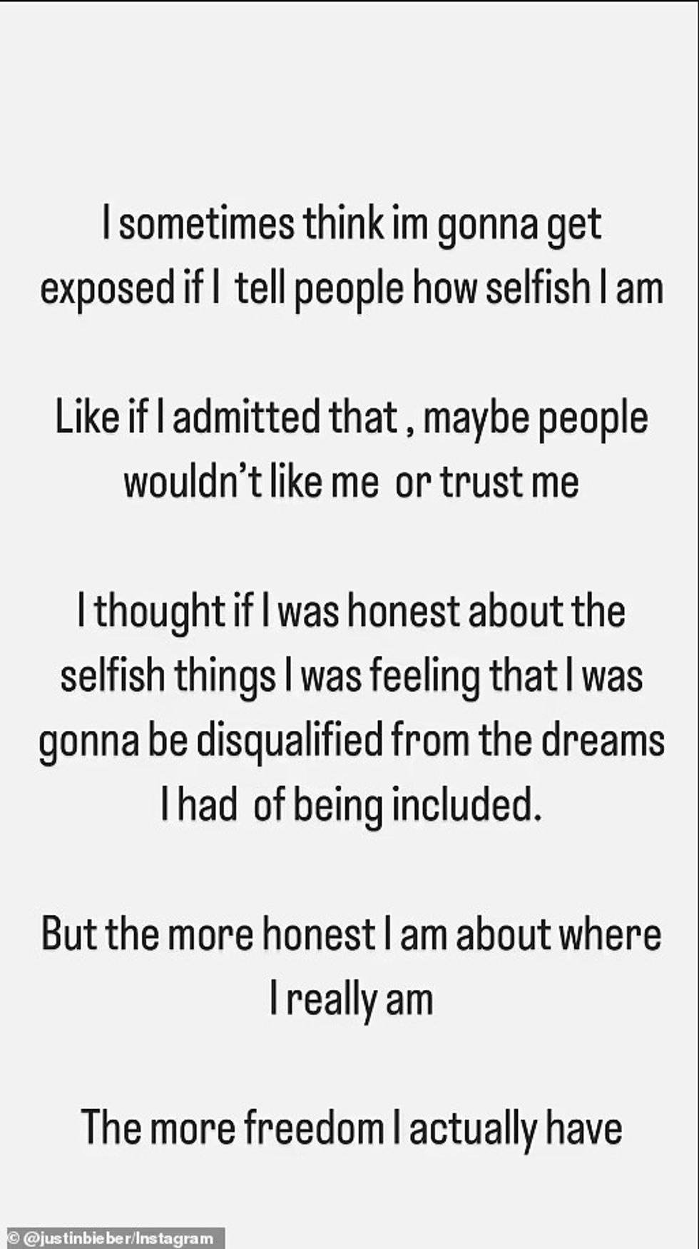 Në mesazhet e publikuara, këngëtari 31-vjeçar e përshkroi veten si “një djalë i zakonshëm me mangësi” dhe tha se shpesh bën apo thotë gjëra që lëndojnë të tjerët pa dashje. Ai foli për pasiguritë e tij, ndjenjën e fajit dhe frikën se mos “ekspozohet” për egoizmin e tij.