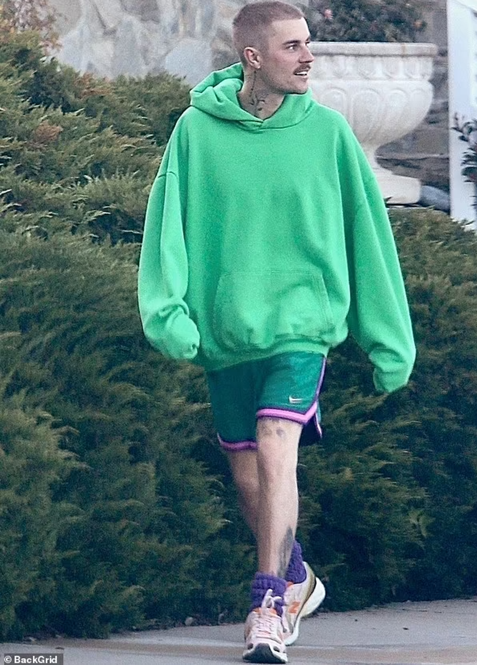 Këngëtari 31-vjeçar, i njohur për hitin “Peaches”, u shfaq me një veshje të rastësishme, duke kombinuar një bluzë jeshile të ndezur me pantallona të shkurta dhe atlete Nike.