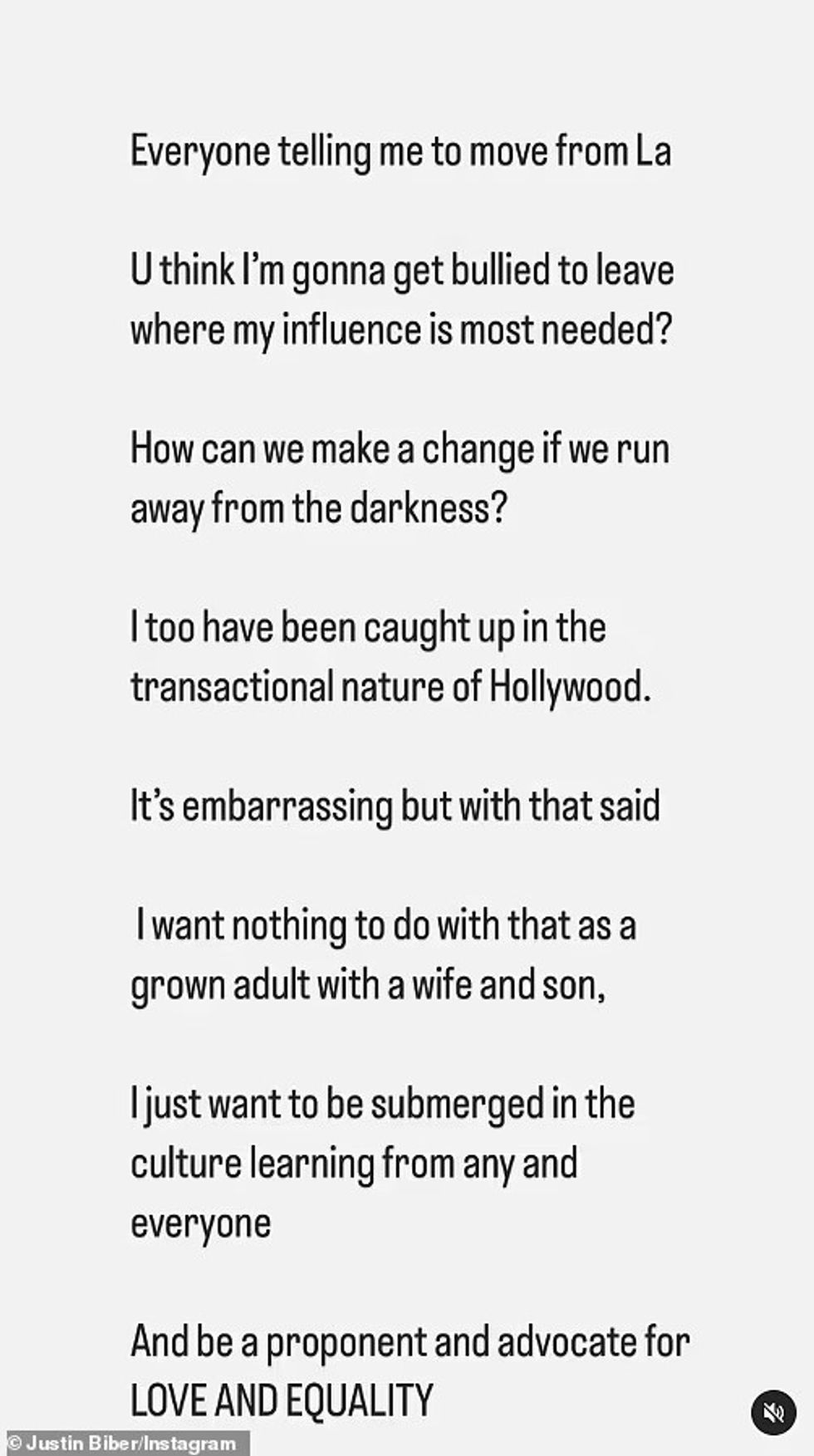 Në një Story në Instagram, ai shkroi: "Sinqerisht, nëse do të isha në vendin tuaj, do të ishte e vështirë të mos ishe xheloz për marrëdhënien time me Hailey. Është diçka e veçantë dhe e kuptueshme pse disa nuk mund ta durojnë."
