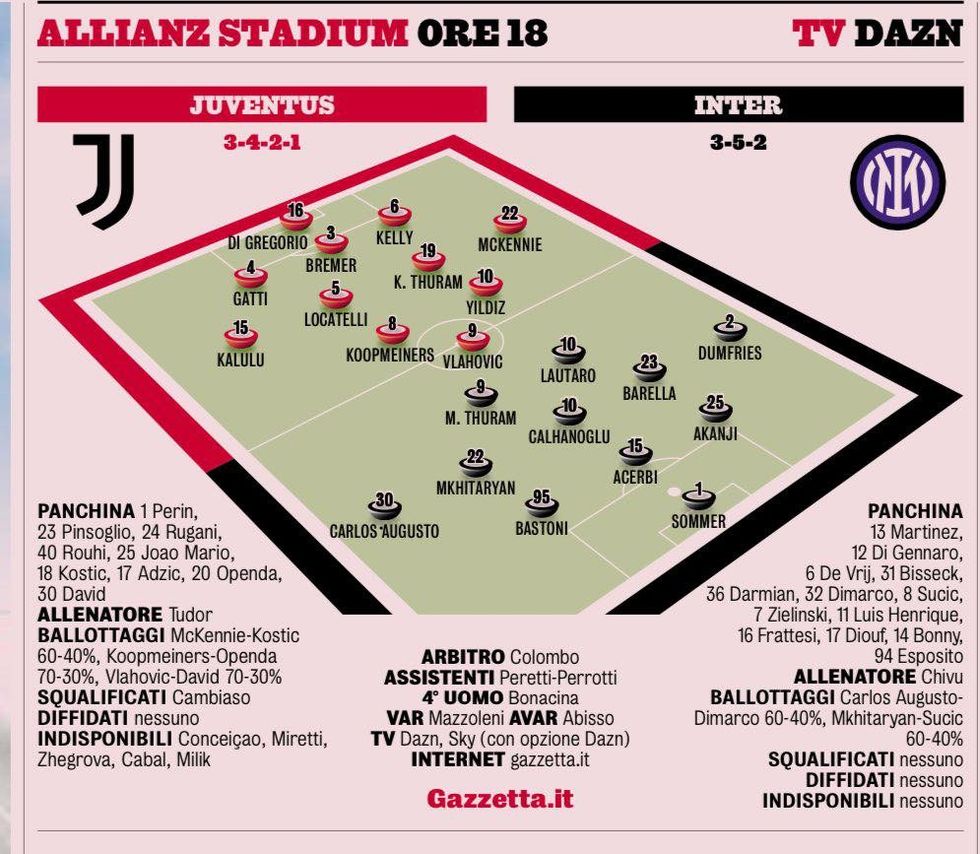 Juventus (3-4-2-1): Di Gregorio; Gatti, Bremer, Kelly; Kalulu, Locatelli, Thuram, McKennie; Koopmeiners, Yildiz; Vlahovic;