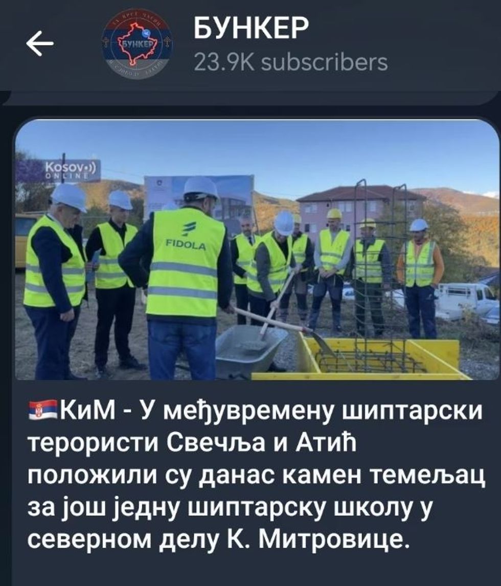 “Terroristët 'shiptarë' [ministri në detyrë i Punëve të Brendshme të Kosovës, Xhelal] Sveçla dhe [kryetari i Komunës së Mitrovicës së Veriut, Erden] Atiq vendosën sot gurthemelin për një shkollë tjetër 'shiptare' në pjesën veriore të Mitrovicës”.