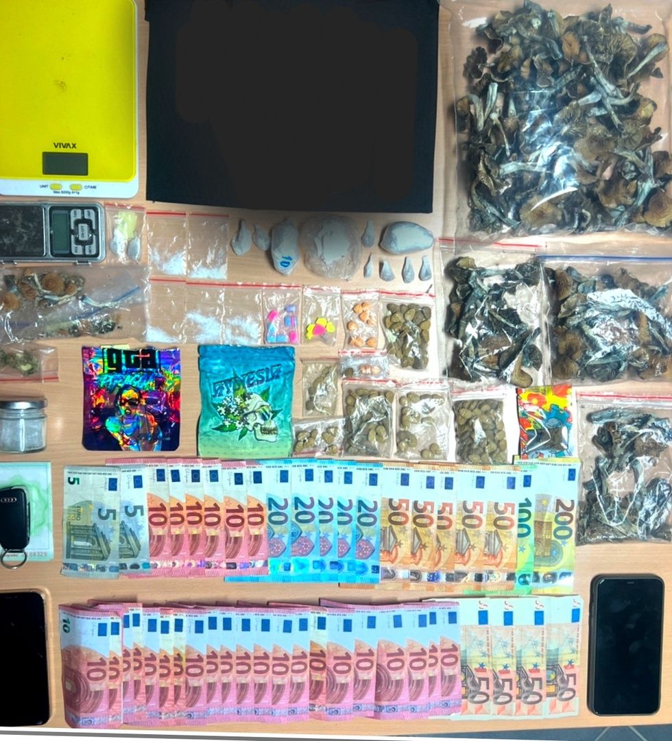 Policia gjatë kontrollit në banesën e një të dyshuari në Prishtinë, ka gjetur dhe sekuestruar katër qese me kërpudha narkotike me peshë 106.7 gramë, 186 copa ekstazi, pesë qese me substancë MDMA - 17 gramë, katër qese kokainë - 22.1 gramë, katër qese dhe një kavanoz me substancë narkotike-ketamin me peshë 109.2 gramë, një qese me marihuanë - 0.7 gramë, 440 euro që dyshohet të jenë të falsifikuara, dy peshore elektronike, 700-800 qese të zbrazura që shërbejnë për paketimin e narkotikeve në sasi të vogla.