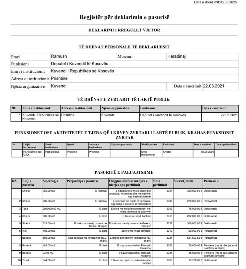 Lideri i Aleancës për Ardhmërinë e Kosovës, Ramush Haradinaj ka deklaruar pasurinë e tij si dhe të bashkëshortes, Anita Haradinaj.