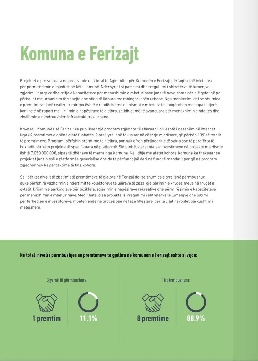 “Kryetari i Komunës së Ferizajt ka të publikuar një program zgjedhor te shkruar, i cili është i qasshëm në internet. Nga 69 premtimet e dhëna gjate fushatës, 9 prej tyre janë fokusuar në çështje mjedisore, që përbën 13% të totalit të premtimeve. Programi përfshin premtime të gjelbra, por nuk ofron përllogaritje të sakta ose të përafërta të buxhetit për këto projekte të specifikuara në platformë. Sidoqoftë, vlera totale e investimeve në projekte mjedisore është 7.050.000.00 eurosh, sipas të dhënave të marra nga Komuna. Në lidhje me afatet kohore, komuna ka theksuar se projektet janë pjesë e platformës qeverisëse dhe do të përfundojnë deri në fund të mandatit por që në program zgjedhor nuk ka përcaktime të tilla kohore”, thuhet në raport, përcjellë organizata “Avonet”.