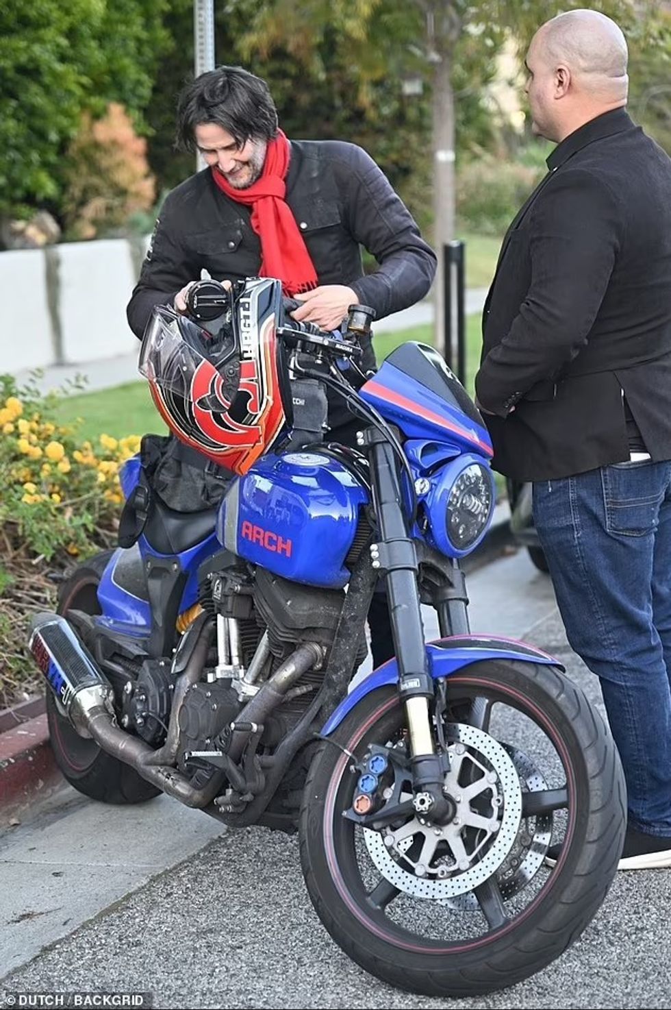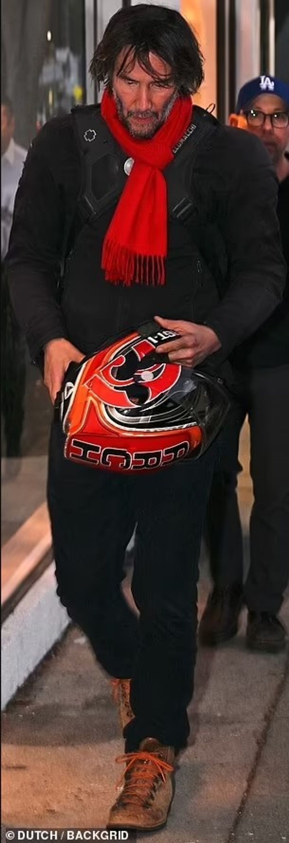 I veshur me një xhaketë motoçiklisti dhe një shall të kuq që binte në sy, aktori konfirmoi statusin e tij si ikonë e stilit dhe aksionit, shkruan DailyMail.