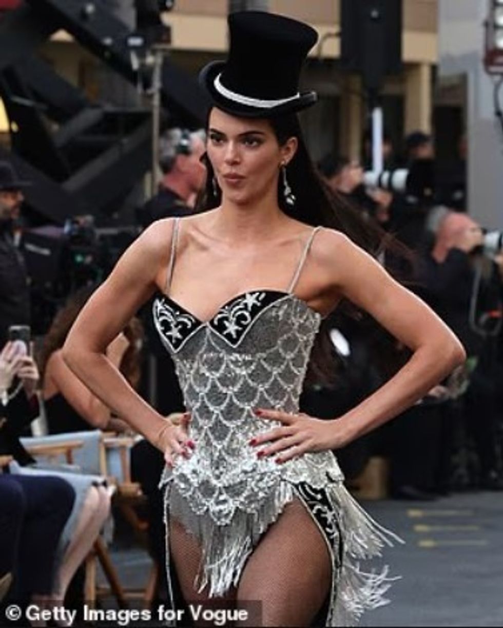 Jenner veshi korsetin e argjendtë me detaje shkëlqyese dhe pëlhurë që i binte pas shpine, ndërsa përfundoi dukjen me kapelë të zezë, geta rrjetë dhe flokë të gjata të errët, shkruan DailyMail.