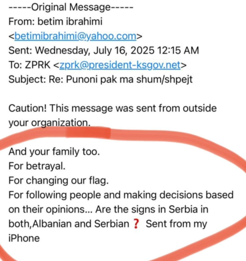 “"Edhe familja jote. Për tradhti. Për ndërrimin e flamurit tonë. Për ndjekjen e njerëzve dhe marrjen e vendimeve bazuar në mendimet e tyre… A janë shenjat në Serbi në të dyja gjuhët, shqip dhe serbisht?"”, shkruhet ndër të tjera në emailin e dërguar më 16 korrik në ora 00:15.