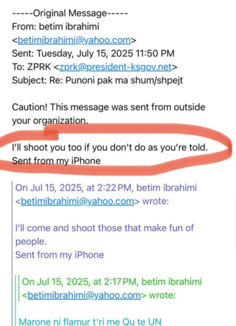 Mesazhi është shoqëruar edhe me një paralajmërim automatik të sistemit informativ të presidencës që e cilëson emailin si të ardhur nga jashtë organizatës.