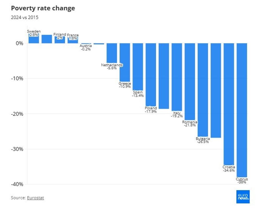 Në të njëjtën kohë, shumë vende të Evropës Lindore dhe Jugore kanë ulur nivelet e tyre të varfërisë me dhjetëra pikë përqindjeje, me Qipron që kryeson në BE (-38%), e ndjekur nga Kroacia (34.6%), Hungaria (26.8%), Bullgaria (26.5%) dhe Rumania (21.8%).