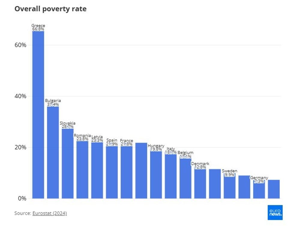 Për shembull, në Greqi, përqindja aktuale është pothuajse 67% - shkalla më e lartë e njerëzve që jetojnë në varfëri midis të gjitha vendeve të BE-së. Bullgaria fqinje vjen pas me 37%, dhe Sllovakia me pothuajse 29%.