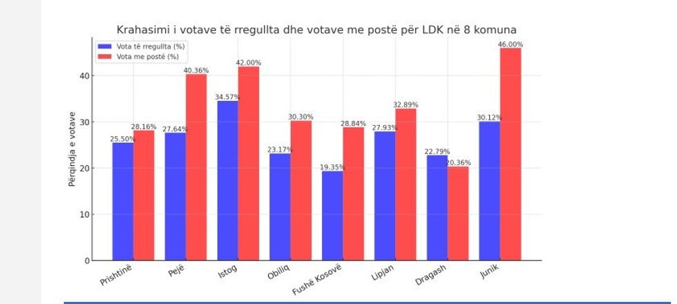 Në anën tjetër, në Pejë, LDK-ja renditet e dyta me 27.64 për qind apo 12 mijë e 318 vota, kurse edhe në votat me postë ,ajo është e dyta me 40.36 për qind apo 1326 vota.