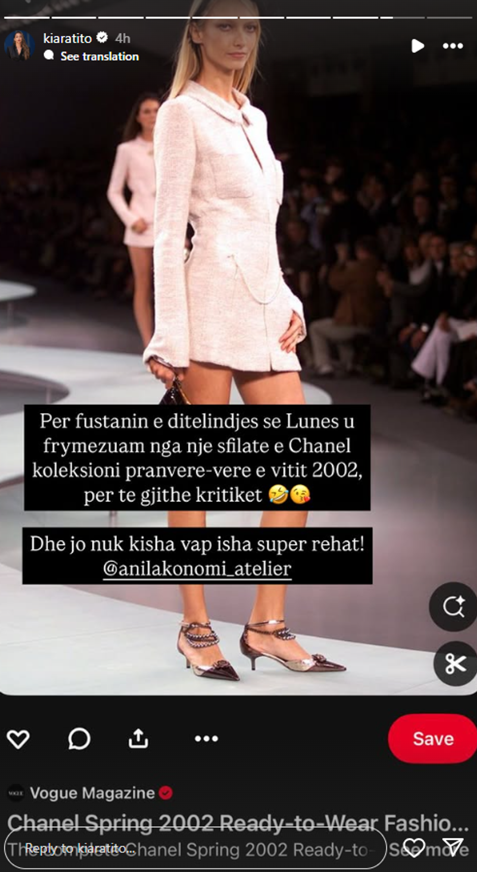 Përmes një postimi në InstaStory, ajo vendosi t’u japë një përgjigje të drejtpërdrejtë atyre që komentuan negativisht për zgjedhjen e saj të veshjes. Kiara sqaroi se fustani nuk ishte thjesht një përzgjedhje spontane, por i frymëzuar nga një sfilatë ikonike e markës së njohur Chanel, konkretisht nga koleksioni pranverë-verë i vitit 2002.