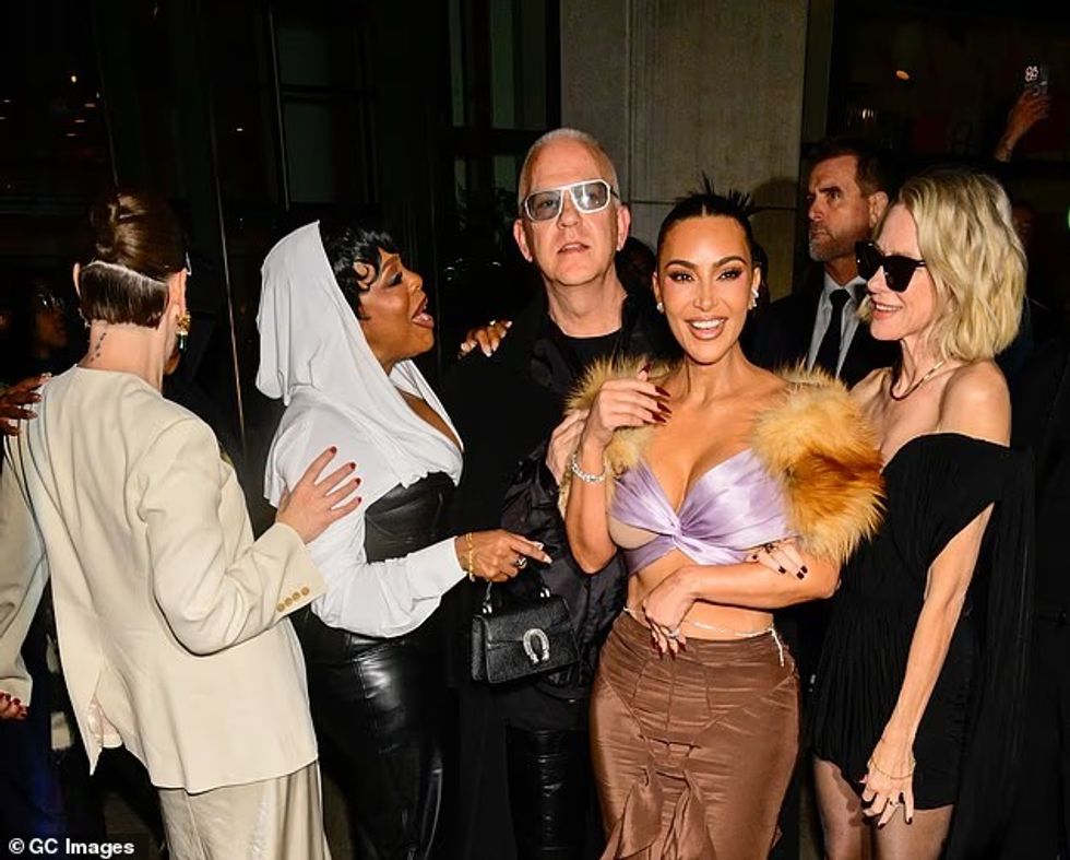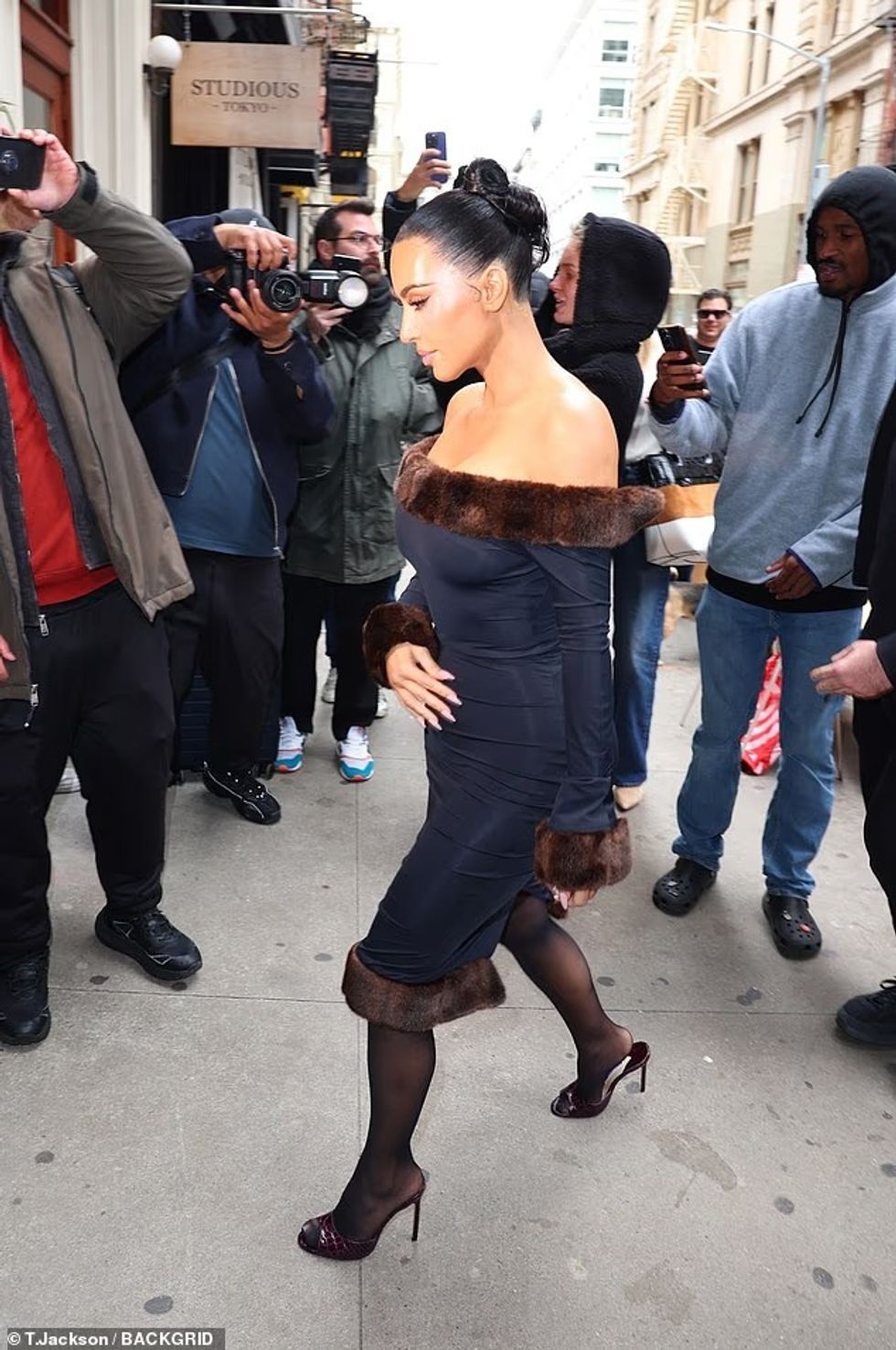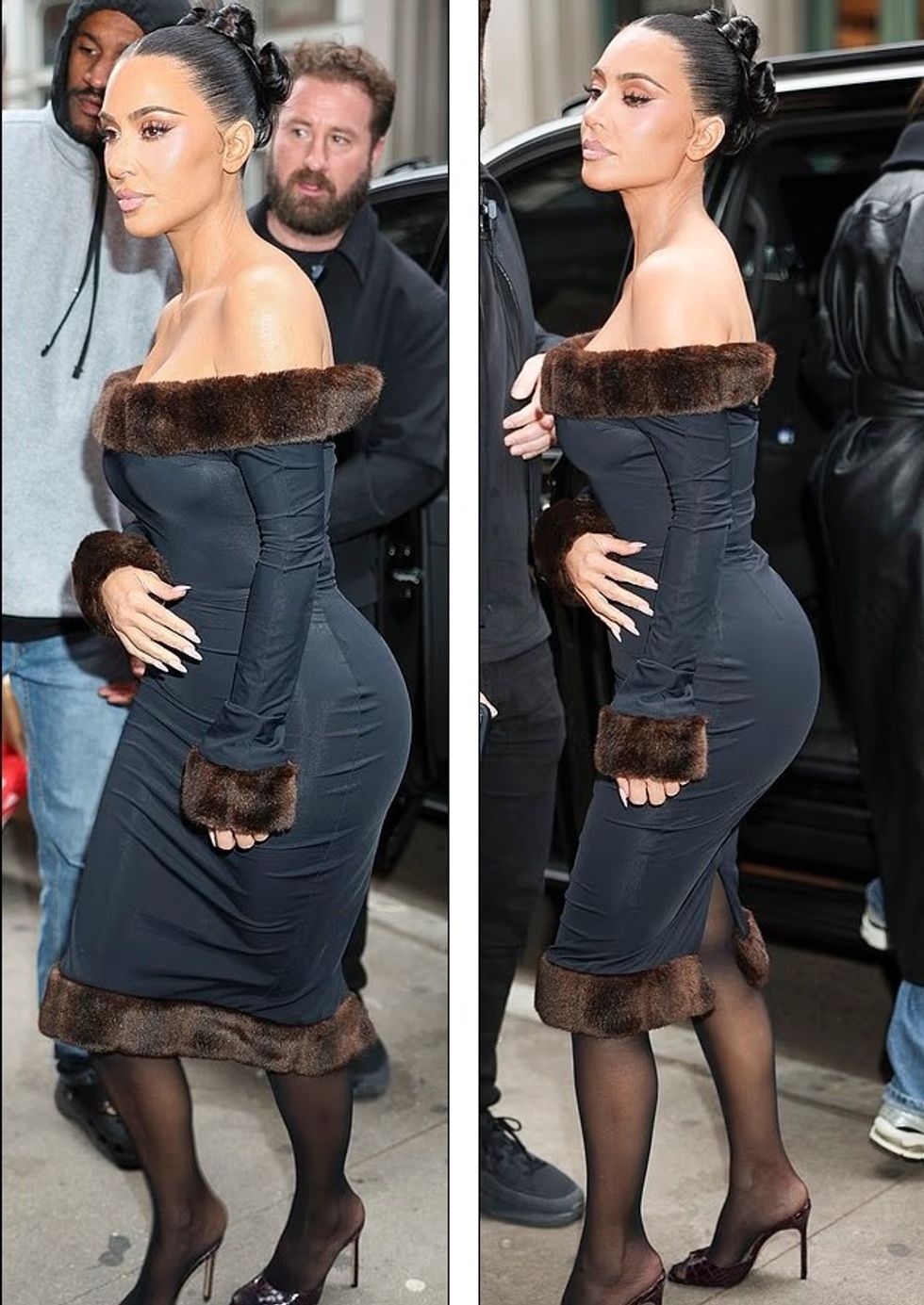 Më herët gjatë ditës, Kardashian ishte fotografuar në lagjen SoHo me një fustan të zi me prerje te shpatullat dhe me detaje peliçe. CEO e SKIMS tregoi linjat e saj të punuara në fustanin e ngushtë, të cilin e shoqëroi me çorape të errëta dhe taka të larta të zgjedhura nga stilistja Soki Mak.
