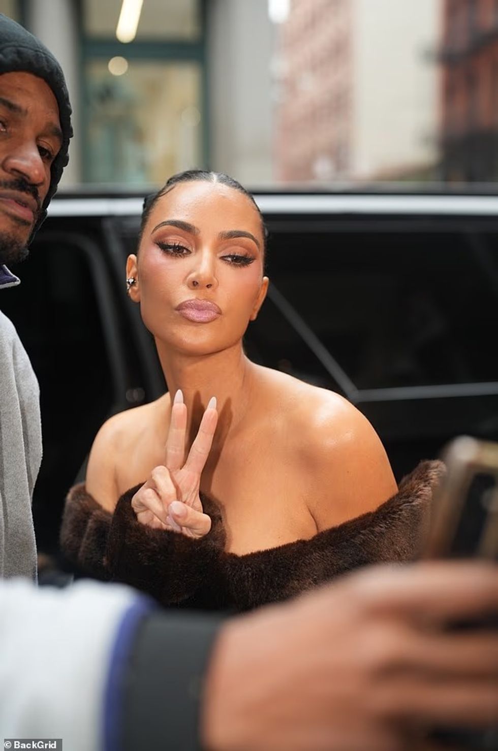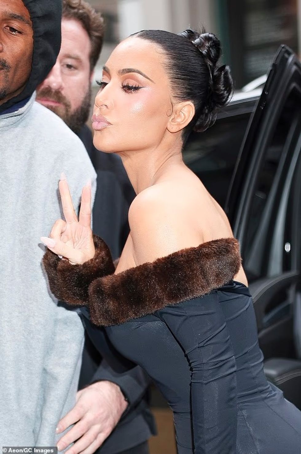 Flokët i ishin stiluar në një topuz kaçurrel nga Matt Benns, ndërsa makeup artisti Ariel Tejada i kishte theksuar tiparet me konturim të plotë përpara se Kim të pozonte në rrugë me fansat në New York.