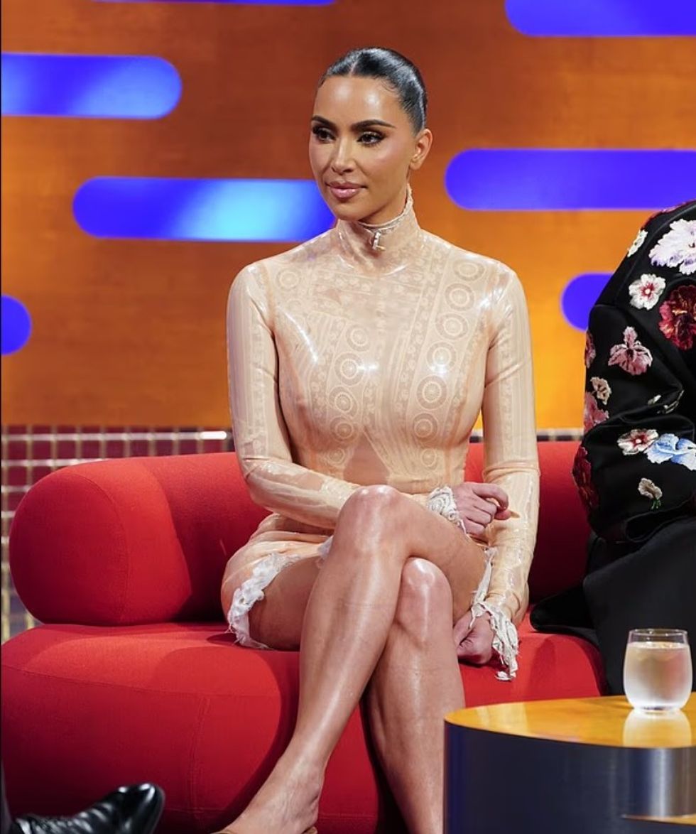 Kim Kardashian shkëlqen me një fustan lateksi në “The Graham Norton Show” gjatë promovimit të serialit të ri “All’s Fair”