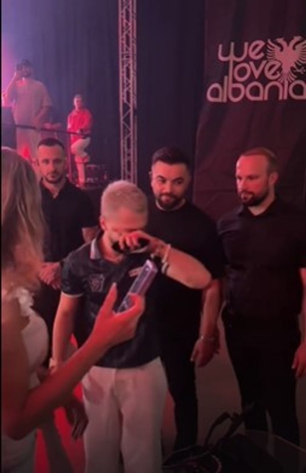 Momenti kulmoi me një përqafim të ngrohtë dhe me fjalët plot emocion të artistit: “Zoti të ruajtë”, përpara se të shpërthente në lot, ndërsa publiku e duartrokiste me emocion dhe respekt.