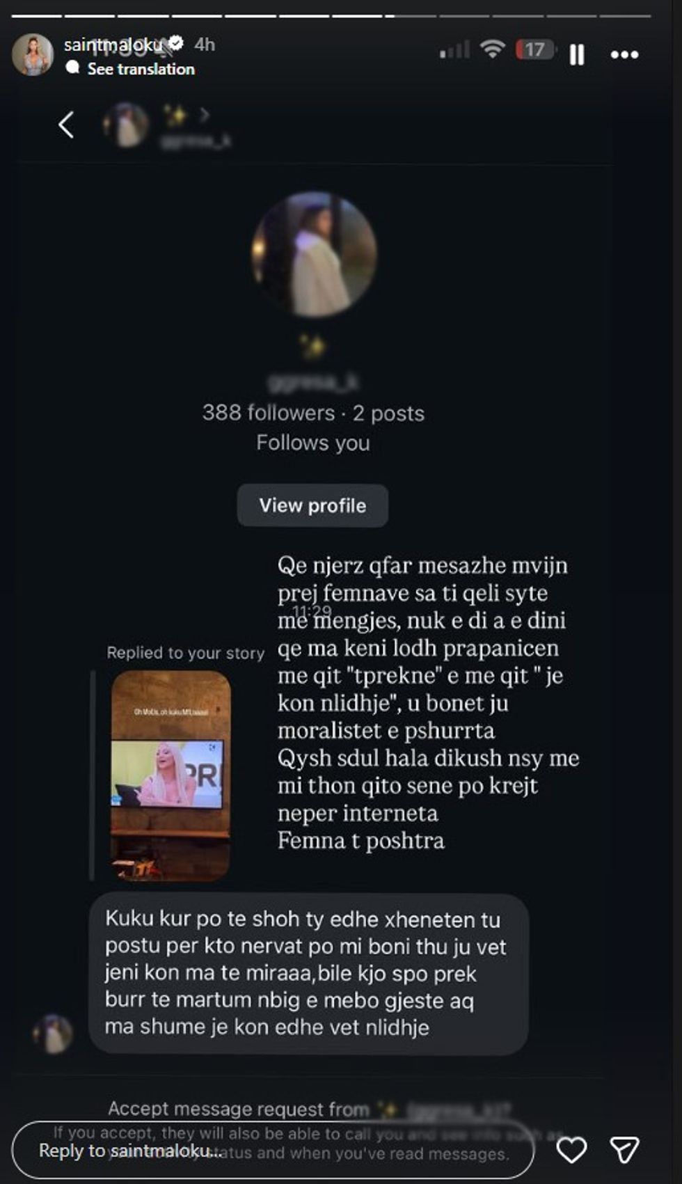 Në InstaStory, ajo publikoi një screenshot të një prej këtyre mesazheve, ku përdoruesja e ofendon duke e quajtur “jomorale” dhe i rikujton situatën e “prekjes” brenda shtëpisë, duke shtuar “të paktën banorja e këtij edicioni nuk po prek burra të martuar”.