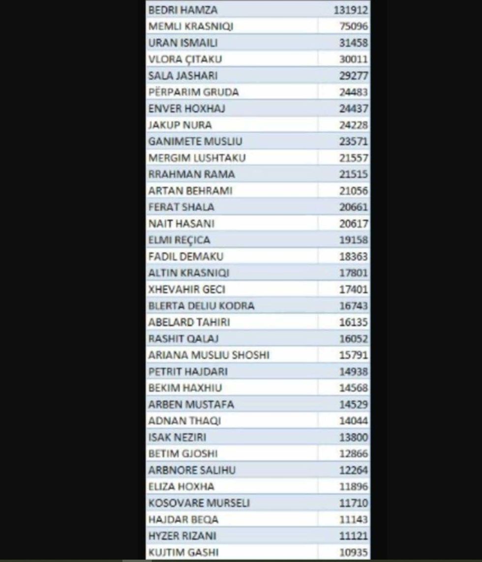 Kandidati i tretë i cili renditet me numër më të madh të votave është Uran Ismaili me mbi 31 mijë vota. Ndërkaq, Vlora Çitaku ka grumbulluar mbi 30 mijë vota sipas listës së fundit të përditësuar me rezultatet.