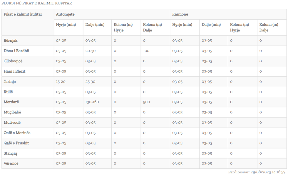 Qendra Kombëtare për Menaxhim Kufitar ka përditësuar të dhënat, duke bërë të ditur se në pikën kufitare të Merdarës pritja për të dal nga Kosova është deri në 2 orë e 40 minuta, apo 160 minuta.
