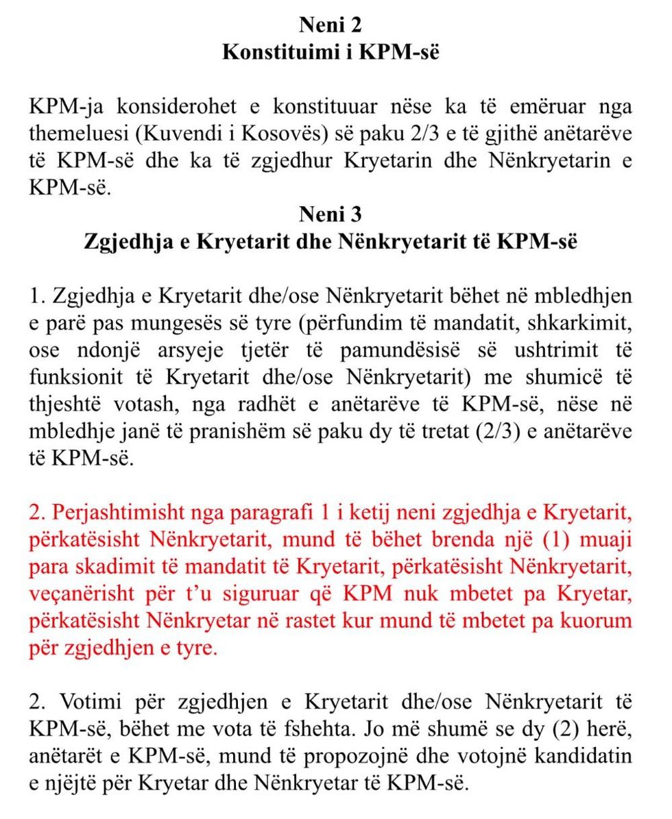 “Unë nuk jam dakord me asnjërën prej tyre. Ndryshimi i rregullores kërkon diskutim publik… duhet të respektohet ky nen i ligjit të KPM-së. Nuk pajtohem edhe me të dytën…. zgjedhja e Kryetarit duhet të bëhet në seancën vijuese dhe argumenti se mund te mbetemi pa kryetari nënkupton se anëtari më i vjetër është përfaqësues i KPM-së. Kjo deri në konstitutimin e një organi të ri anëtarëve të rinj dhe sikur ishte më herët kur të vijnë anëtarët e ri dhe siç thotë rregullorja me 2/3 zgjidhet nënkryetari dhe Kryetari i ri”, ka thënë Mehmeti.