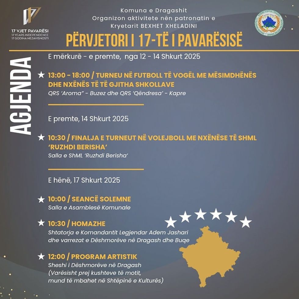 Komuna e Dragashit ka njoftuar se për nder të përvjetorit të 17-të të pavarësisë së Kosovës do të organizohen aktivitete të ndryshme festive përgjatë disa ditëve.