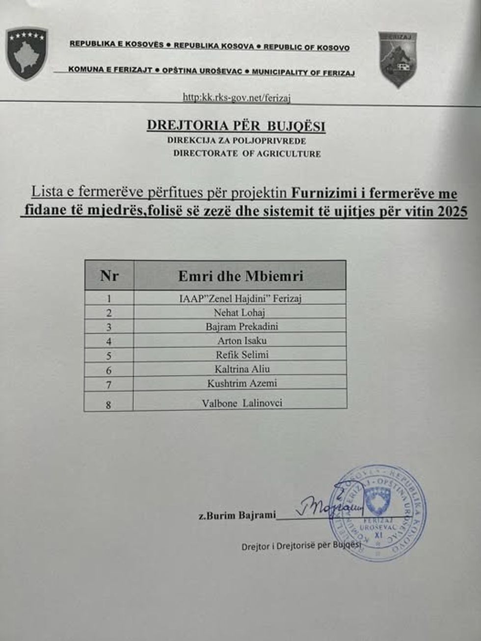 “Kriteret kanë qenë të lehta dhe këta tetë fermer i kanë plotësuar kriteret për të përfituar nga 25 ari me fidane të mjedrës. Si komunë kemi planifikuar t’i shpërndajmë këto fidane për 2 hektar në përgjithësi. Vlenë të theksohet se të gjithë fermerët gradualisht po përfitojnë mbështetje institucionale në kultura dhe projekte të ndryshme. Qëllimi jonë është që ta zhvillojmë sa më shumë bujqësinë dhe t’i përkrahim fermerët në forma të tilla”, ka thënë Bajrami./Telegrafi/