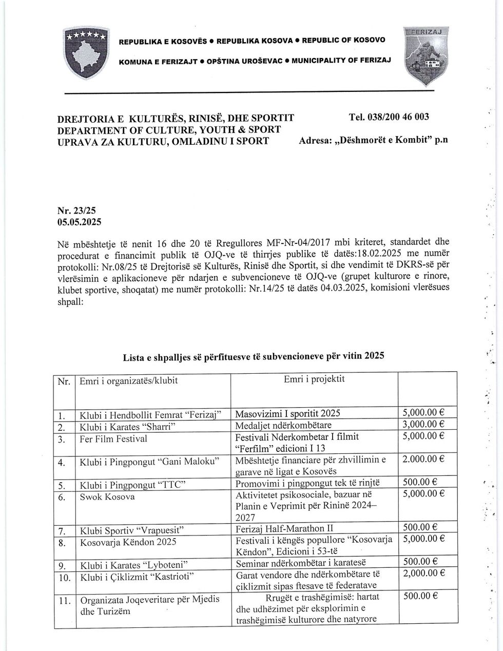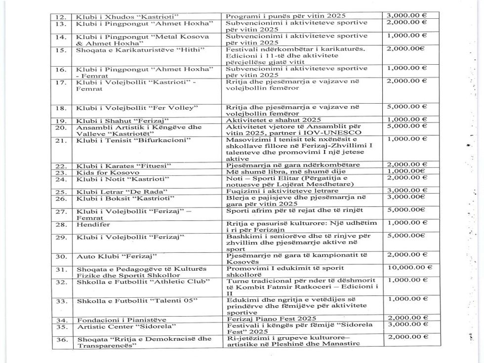 Sipas njoftimit të komunës komisioni vlerësues ka shpallur listën e përfituesve duke u mbështetur në nenin 16 dhe 20 të rregullores MF-Nr-04/2017 mbi kriteret, standardet dhe procedurat e financimit publik të OJQ-ve.