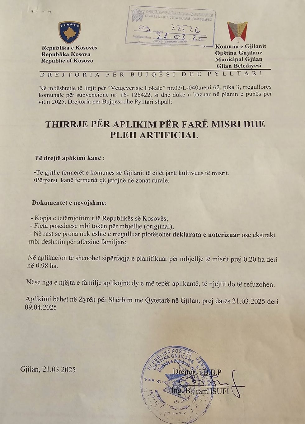 Drejtori për Bujqësi, Bajram Isufi, tha se duke u bazuar në planin e punës për këtë vit, kanë shpallur thirrje për aplikim për farë misri dhe pleh artificial. Aplikimi ka nisur nga 21 marsi dhe mbyllet më 9 prill.