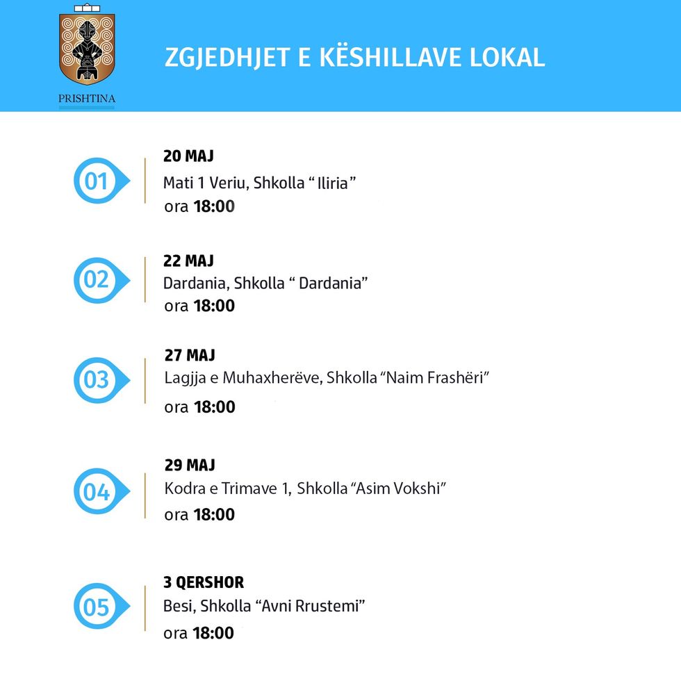 "Ju njoftojmë se, me vendim të Komisionit për Këshilla Lokal, do të vazhdojmë me fazën e radhës së zgjedhjes së Këshillave të Fshatrave, Vendbanimeve dhe Lagjeve Urbane në Komunën e Prishtinës. Ftojmë të gjithë banorët e këtyre zonave, që të marrin pjesë në këto takime. Më poshtë gjeni datat, kohën dhe vendin e mbajtjes së kuvendeve", thuhet në njoftimin e komunës. /Telegrafi/