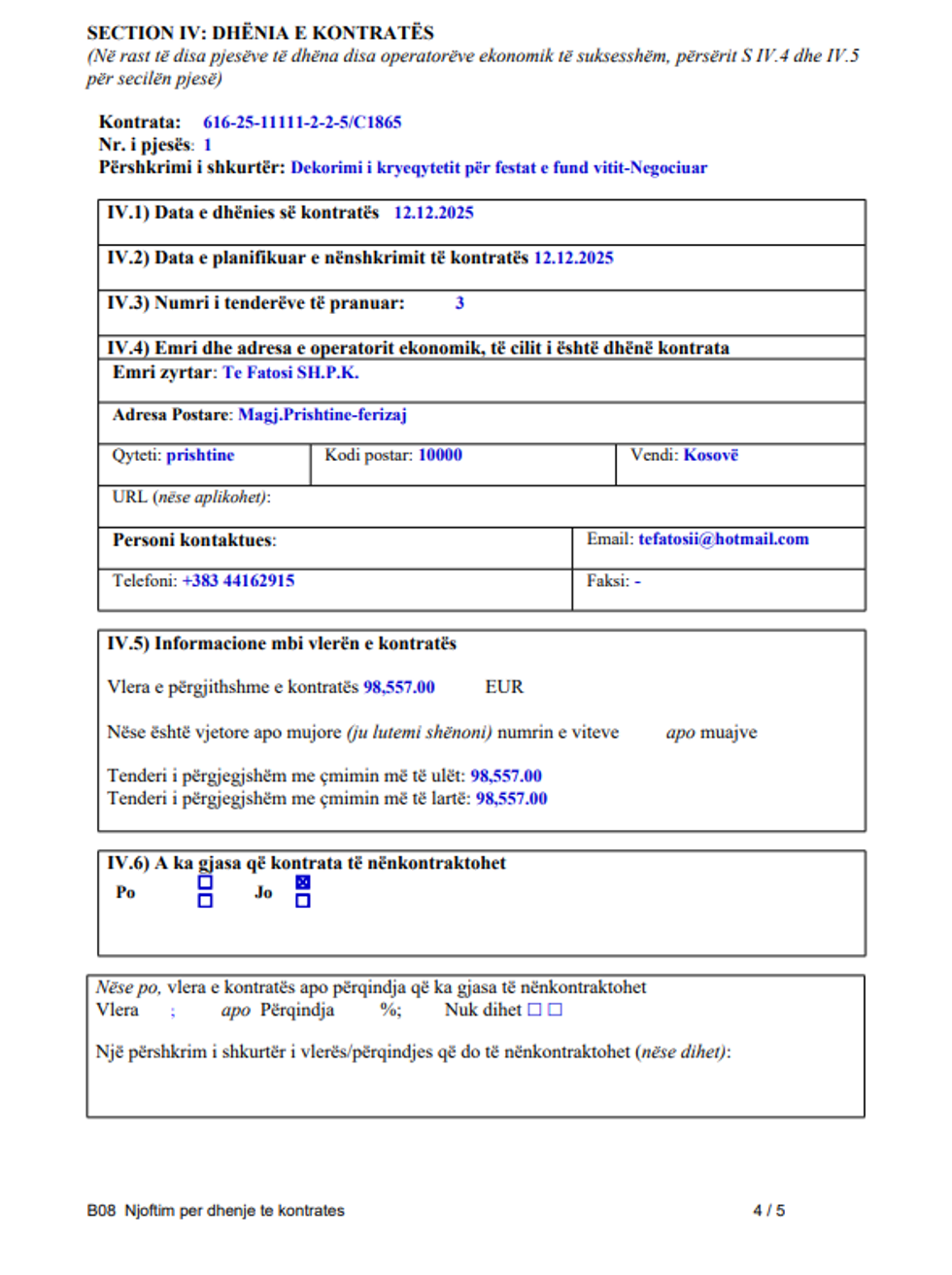 Vlera e parashikuar e kontratës ka qenë 100 mijë euro, ndërsa vlera përfundimtare e kontratës së nënshkruar është 98,557 euro, raporton Telegrafi.