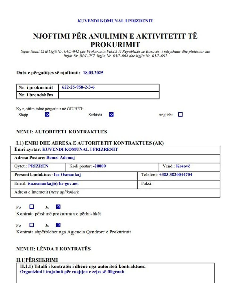Si arsye nga Komuna e Prizrenit është cekur se një dispozitë në Ligjin e Prokurimit Publik kërkon anulimin e këtij aktiviteti të prokurimit.